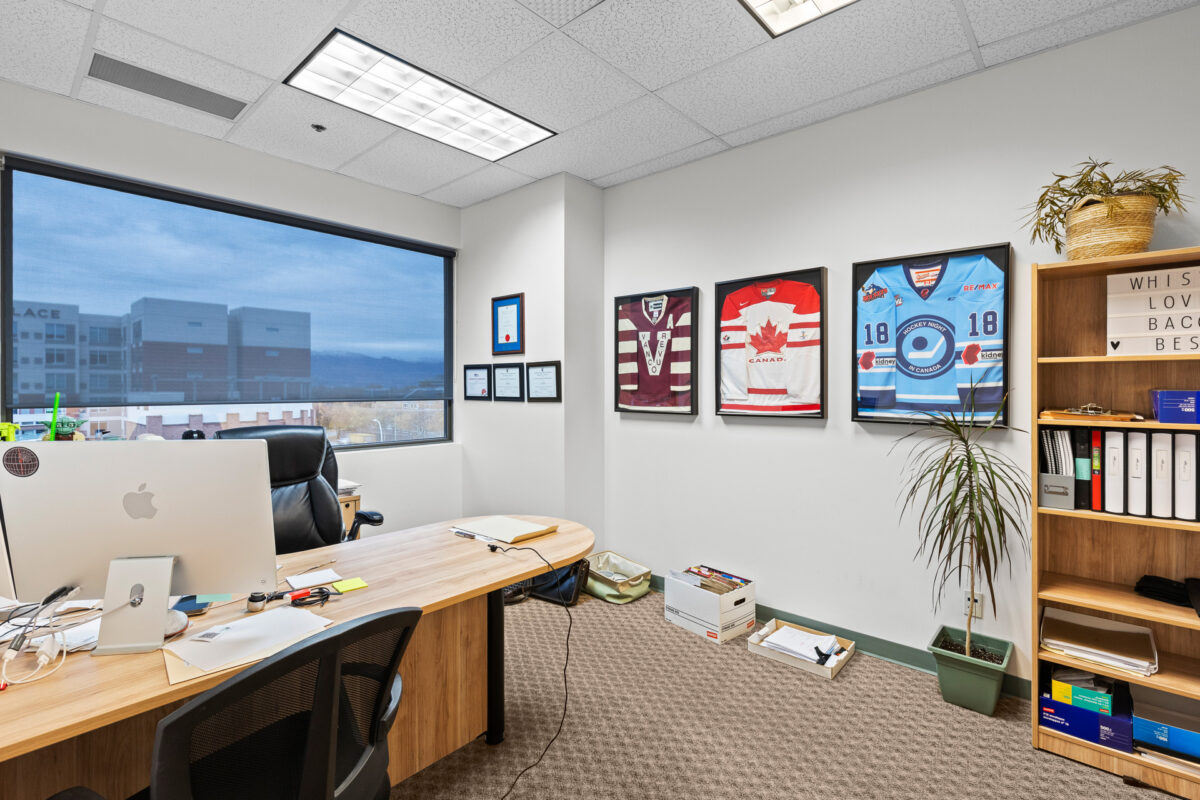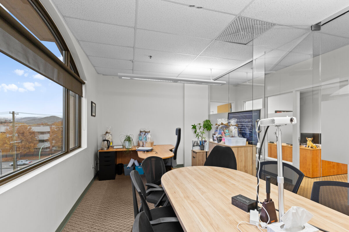 Prime third-floor office space available in one of Kelowna’s most central and established business districts. This unit offers a functional layout ideal for a variety of professional users, featuring a welcoming reception area, multiple private offices, a dedicated boardroom, and generous window lines providing natural light throughout. The space includes storage, glass partitioning, and a mix of open and enclosed work areas that support both collaborative and private workflows. Neutral finishes, quality lighting, and professional improvements make this a move-in-ready option for businesses looking to elevate their workspace. Elevator accessible. Located just off Enterprise Way with quick access to Highway 97, public transit, and nearby amenities, the building provides excellent convenience for staff and clients alike.